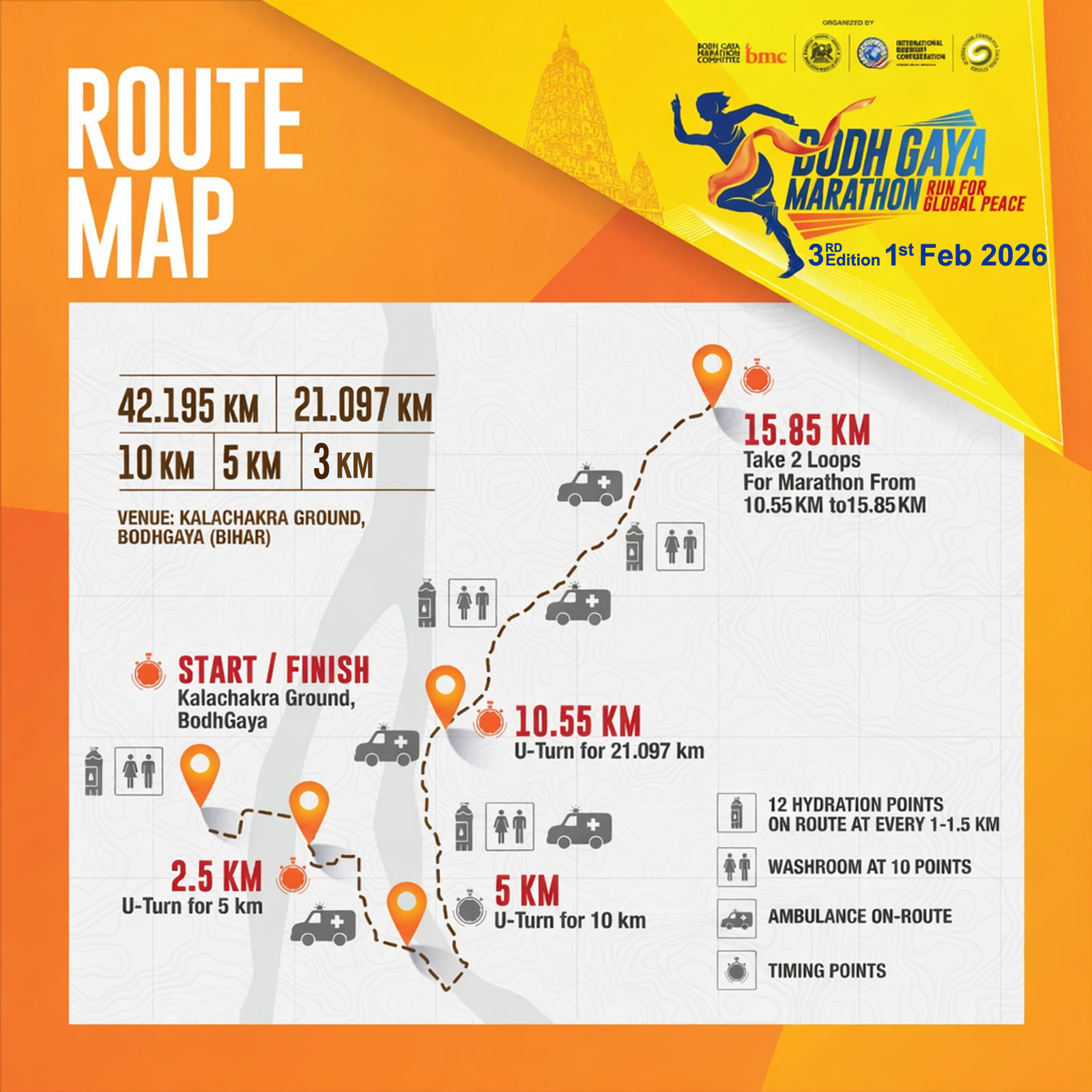 *Details of Race Start time, Eligibility criterion, Registration Fees & Expo for the Bodh Gaya Marathon 2027 have not yet been released. Above are details from the 2026 race event for reference.